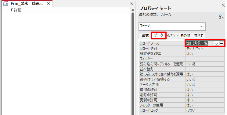 ・フォームの レコードソース にテーブルを設定する