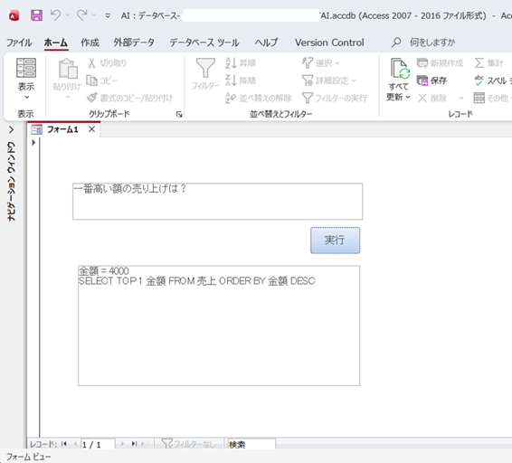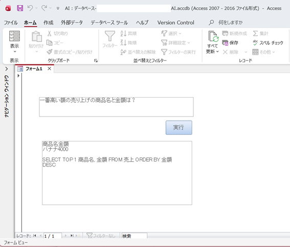 生成AIがSQLを生成してAccessで実行した画面例です。